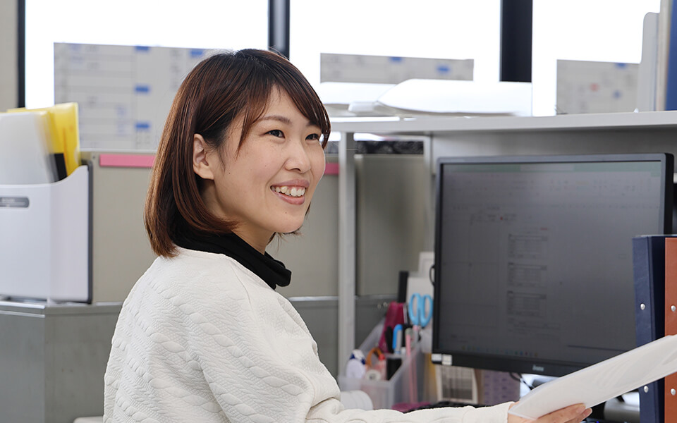 総務部では、総務・経理・労務や社内文書の管理などバックオフィスを広く担っています。私は入社当初パソコンが得意ではなく、会社のサポートを受けながらパソコン教室にも通ってスキルを高めました。入社2年目には、設計アシスタントや製造機器に設定するプログラム作成のサポートも行うようになったので、勉強して良かったと思います。